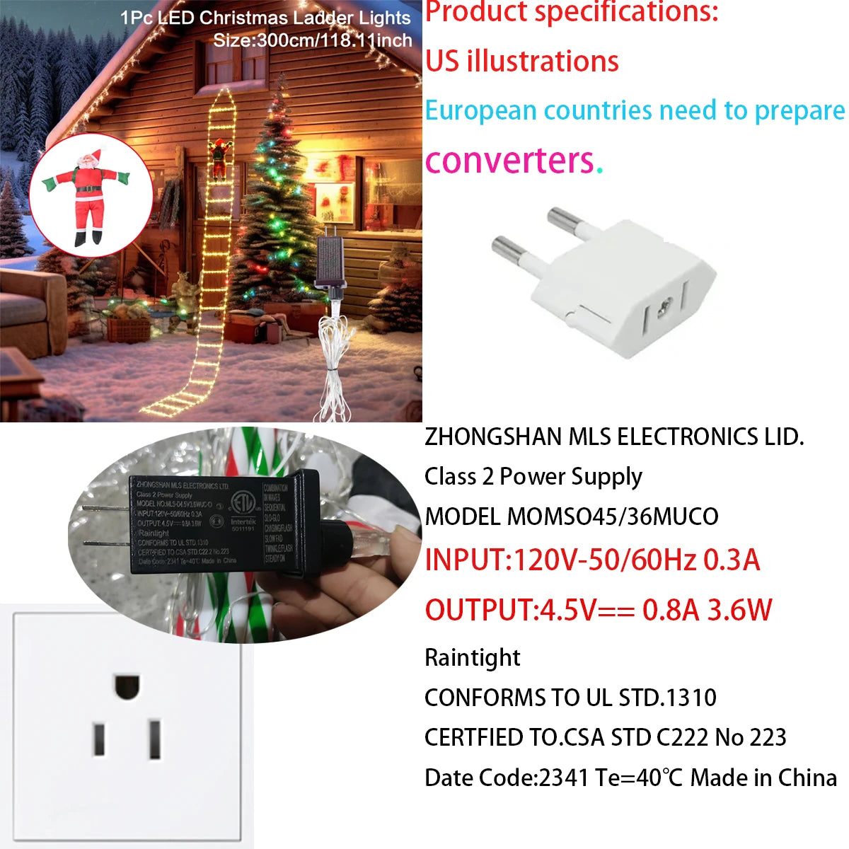 Product specifications: Input: 120V-50/60Hz 0.3A