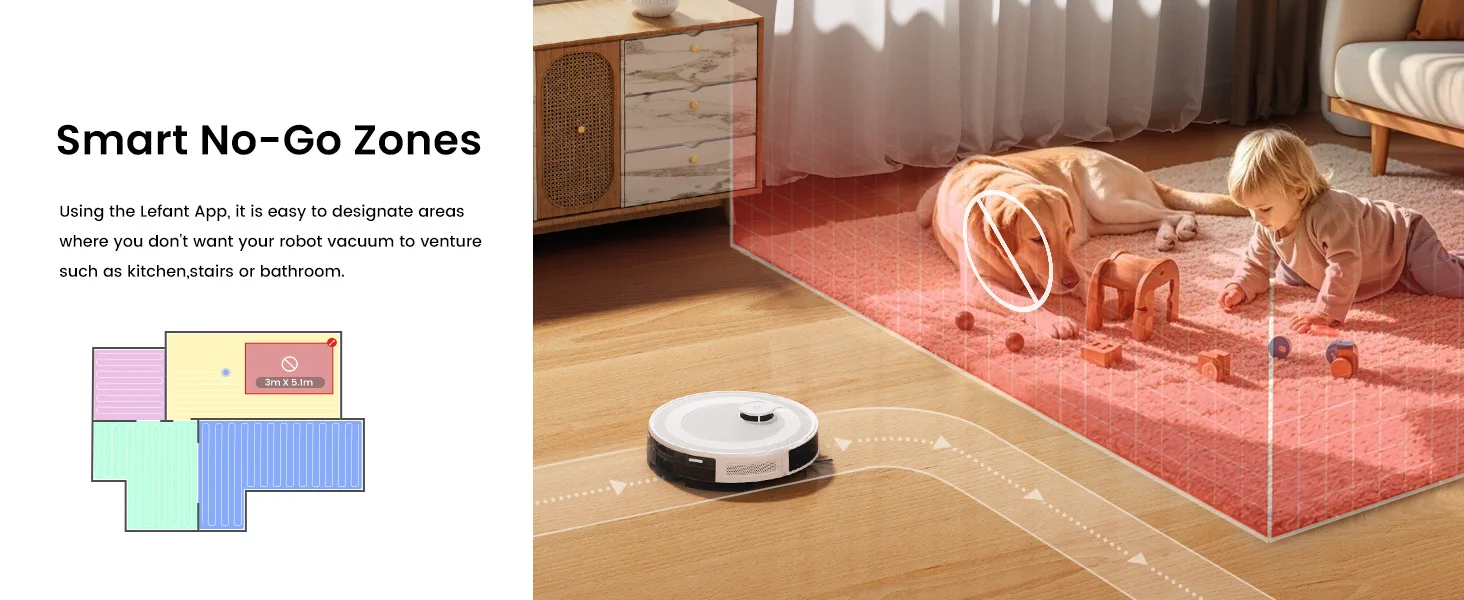 Using the Lefant App, it is easy to designate areas where you don't want your robot vacuum to venture such as kitchen, stairs or bathroom.