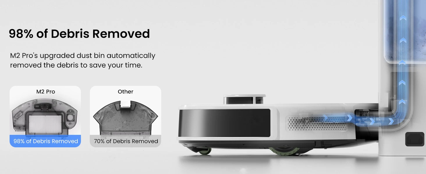 M2 Pro's upgraded dust bin automatically removed the debris to save your time.